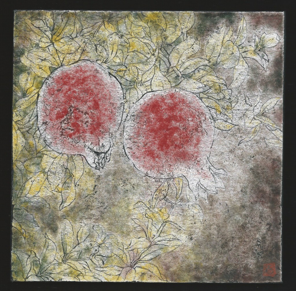 近所の石柱にザクロが浮き彫りされている真成寺(鬼子母神)さん。その階段の脇にあるザクロの木。ザクロの花は朱色で…